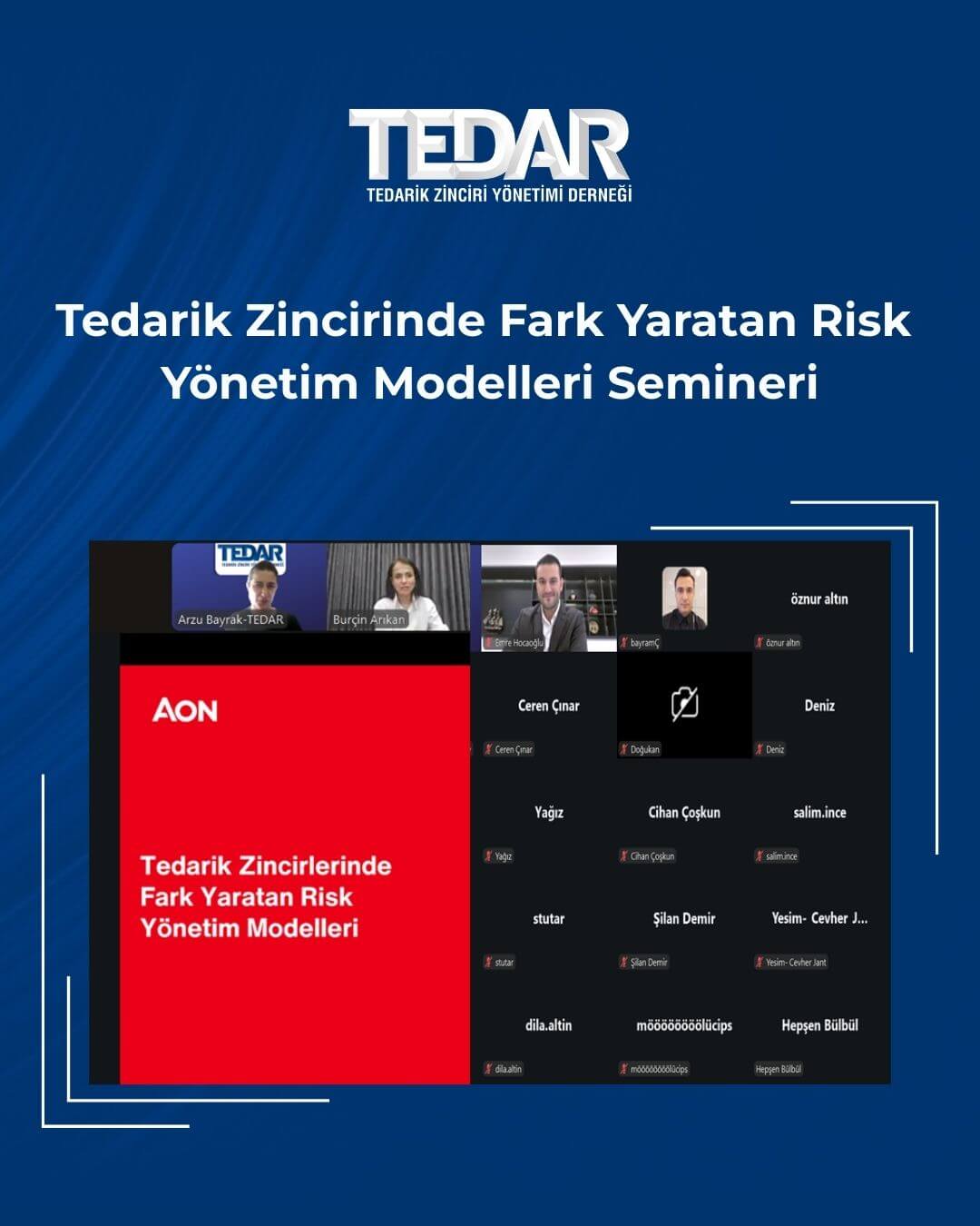 TEDAR (Tedarik Zinciri Yönetimi Derneği), sektörlerinde önde gelen 7 firma tarafından (Siemens Türkiye, QNB Finansbank, Bosch Türkiye, BSH, Zer A.Ş., Borusan Holding ve ArcBlue), Aralık 2013’te kuruldu. TEDAR, üyeleri ve ilgili paydaşları ile birlikte, tedarik zinciri yönetimi prensipleri ve iyi uygulamalarını aktararak iş dünyasının beklentilerine katkıda bulunmayı, tedarik zinciri / satınalma fonksiyonunun ve profesyonellerinin gelişmesine, şirketlerin ve ülkemizin rekabetçiliğine katma değer yaratmayı amaçlamaktadır.